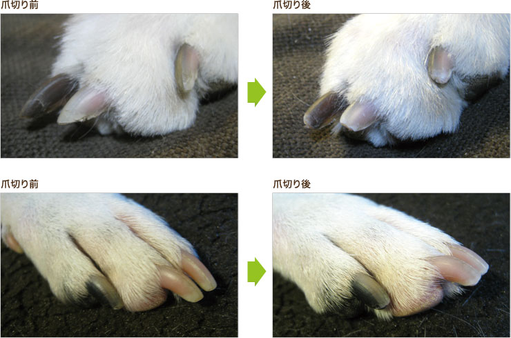 爪はほっておくと放射線状に伸び続け、しまいには肉球に食い込んでしまいます。また、爪が伸びて床を傷つけてしまったり、爪がカーペットなどに引っ掛かってけがの原因になります。そのため、定期的な爪切りが必要です。